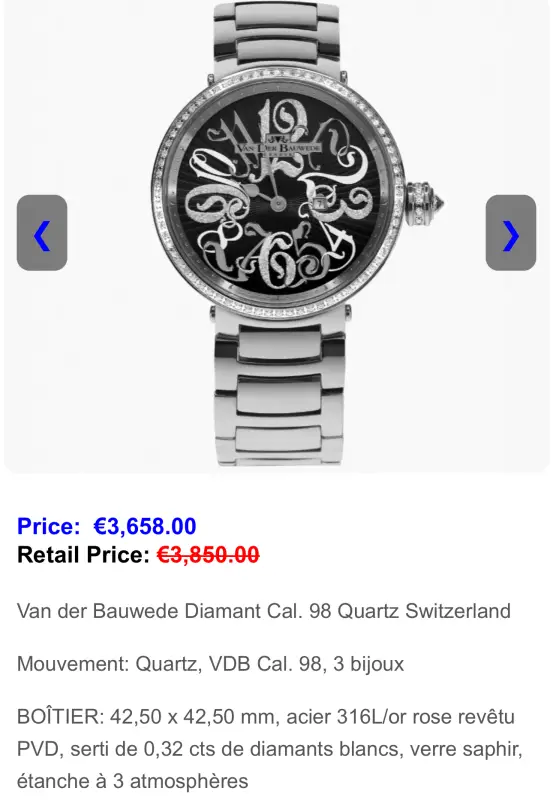 Đồng hồ Van Der Bauwede Diamond Cal. 98 Quartz Bg Swiss Made Hàng chính hãng Thụy Sĩ sản xuất. Nguyên zin 100% Rất Mới Đẹp