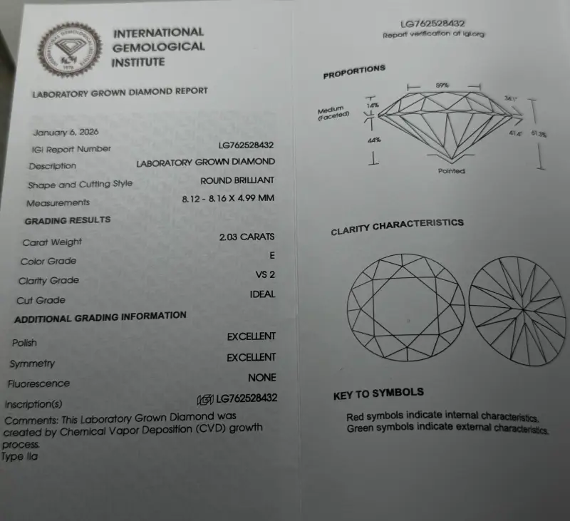 Viên kim cương CVD 8Ly12 – 8Ly16 x 4,99mm nước E độ sạch VS2 có giấy IGI kiểm định mã IGI LG762528432