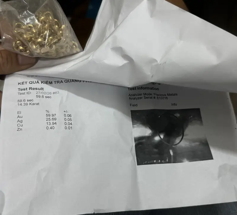 Tổng Nặng 1,036 Lượng = nếu tính chuẩn 100% theo GlÁ vàng tuổi Au600 nấu xác ( khò ) hôm nay thôi đã 105,7 TRlỆU
