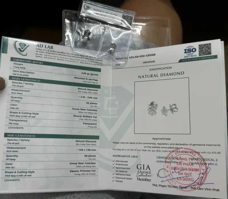 - bằng vàng 9k ( Au23,92 + Palladium 13,8% ) đính 8 viên kim Cương thiên nhiên vuông 1Ly6 Loại Rất đẹp, Sạch và nước khá Trắng chiếu sáng Rực lửa Lấp Lánh